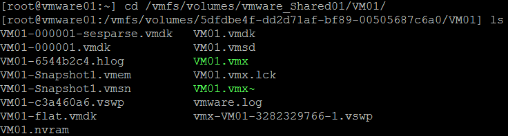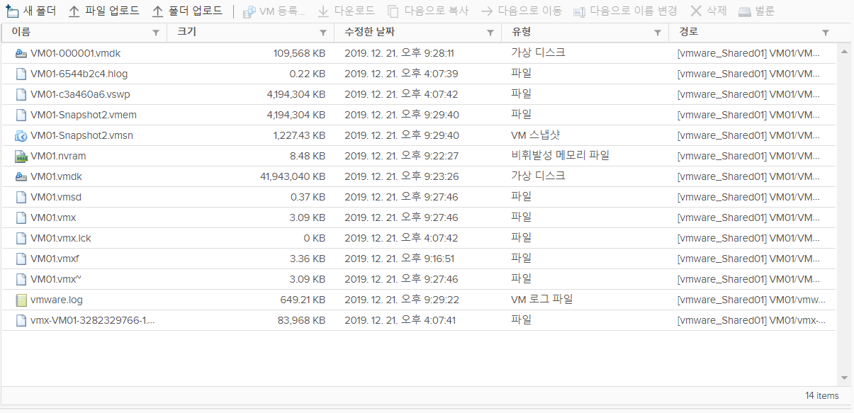 - 스냅샷 가상 머신 > 기본 구성 파일 + 스냅샷 파일 + (콘솔)flat.vmdk 파일 + (콘솔)delta/sesparse.vmdk 파일