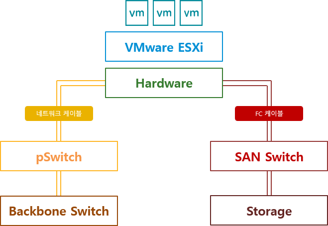 FC 케이블을 통해 SAN 스위치와 연결 및 조닝 후 스토리지 영역에 VM을 데이터로 저장한다.