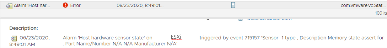 Alarm ‘Host hardware sensor state’ on { ESXi Host } triggered by event 715157 ‘Sensor -1 type , Description Memory state assert for Part Name/Number N/A Manufacturer N/A’