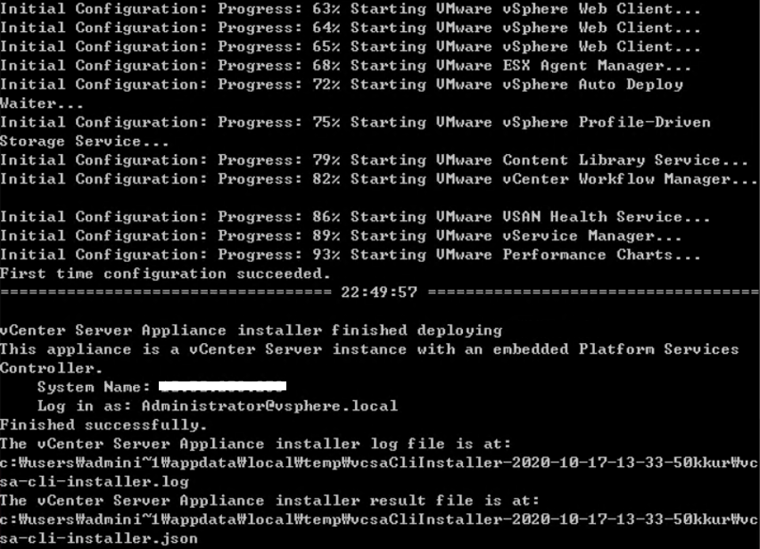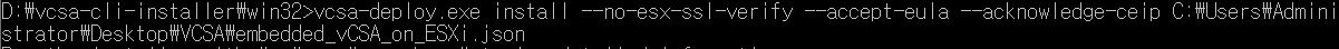 ~#vcsa-deploy.exe install --no-esx-ssl-verify --accept-eula --acknowledge-ceip C:\Users\Administrator\Desktop\VCSA\embedded_vCSA_on_ESXi.json