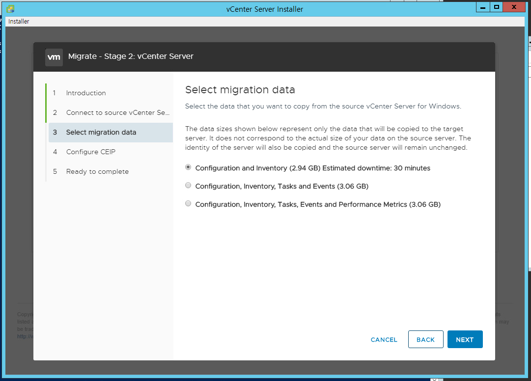 여기서 기존의 vCenter 데이터를 얼만큼 가져올지 고를 수 있다.