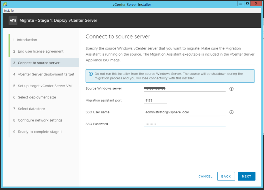 Windows vCenter의 IP와 관리자 계정 정보를 입력하고 NEXT를 누르면 된다.