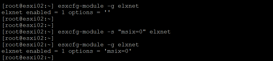 ~#esxcfg-module -s "msix=0" elxnet