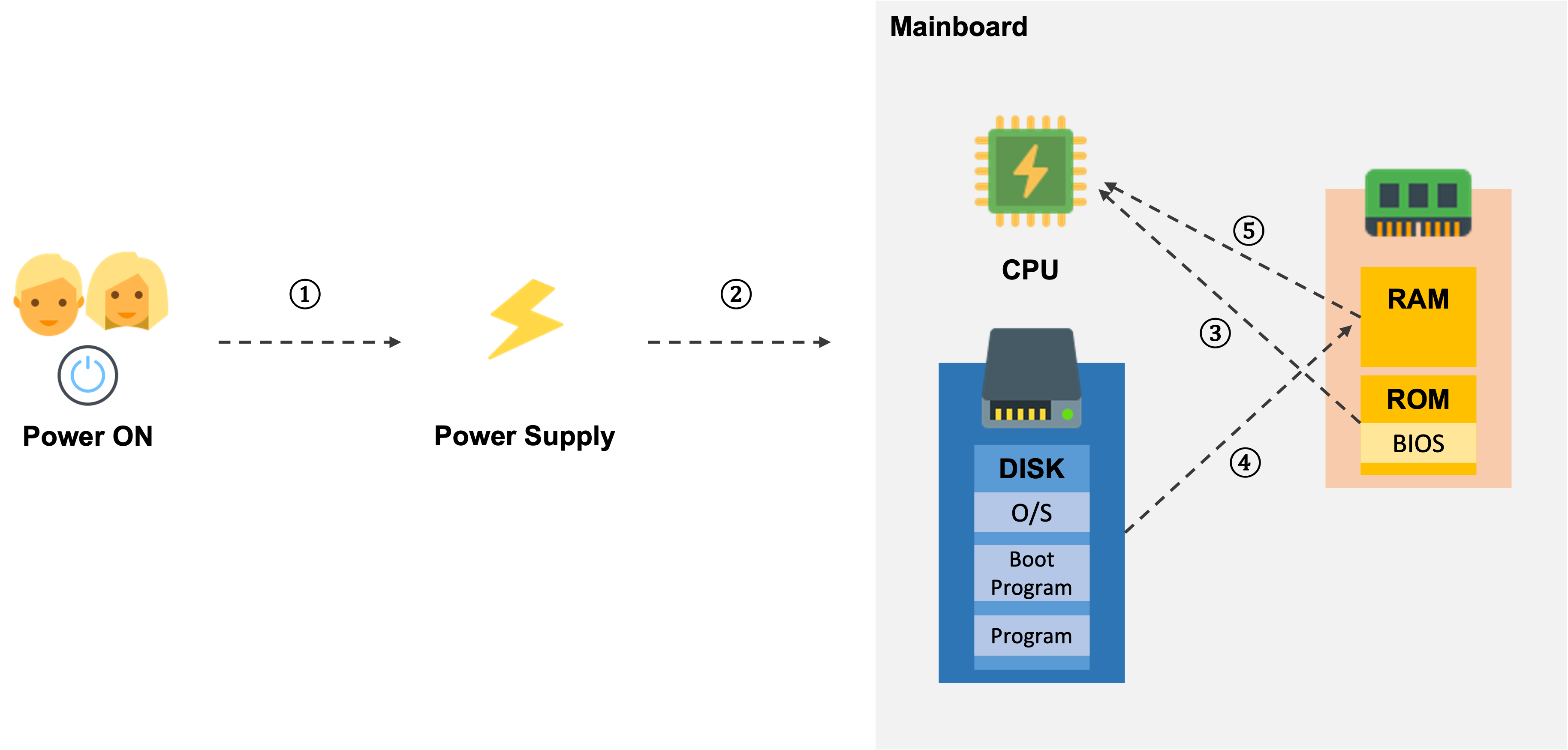 - 전원이 공급되면, 가장 먼저 CPU가 ROM에 있는 BIOS를 실행시킨다.