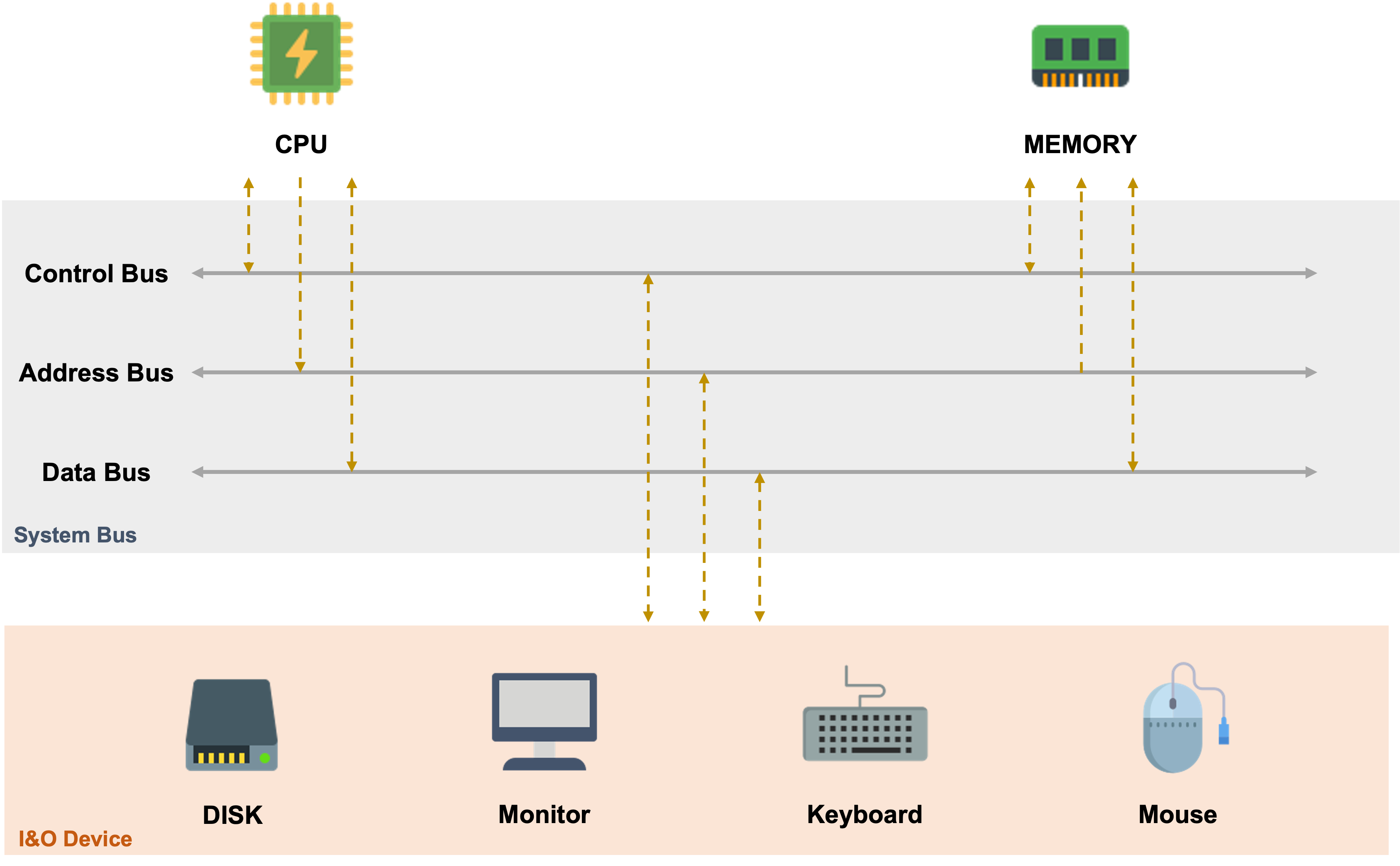 우리가 실제로 교통수단으로 이용하는 버스처럼, 버스가 손님(Data)를 태우고 각 정거장(CPU, Memory, I&O Deivce . .)에 들른다고 보면 된다.
