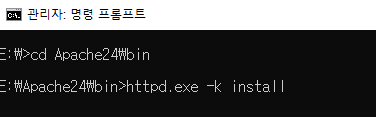 CMD(관리자 권한 실행) 창에서 Apache24 폴더가 있는 위치로 이동 후 아래 명령어 수행