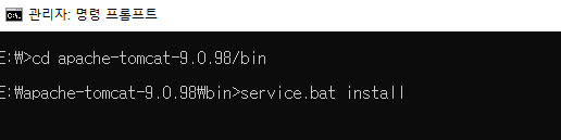 CMD(관리자 권한 실행) 창에서 Tomcat의 bin 폴더가 있는 위치로 이동 후,
