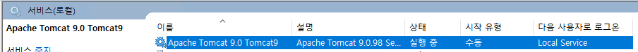 그럼 사진과 같이 Windows 서비스에 Tomcat이 생성되고,