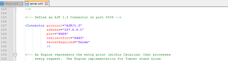 Tomcat은 WEB 서버로부터 AJP 프로토콜을 통해 8009 포트로 요청 받도록 설정됩니다.