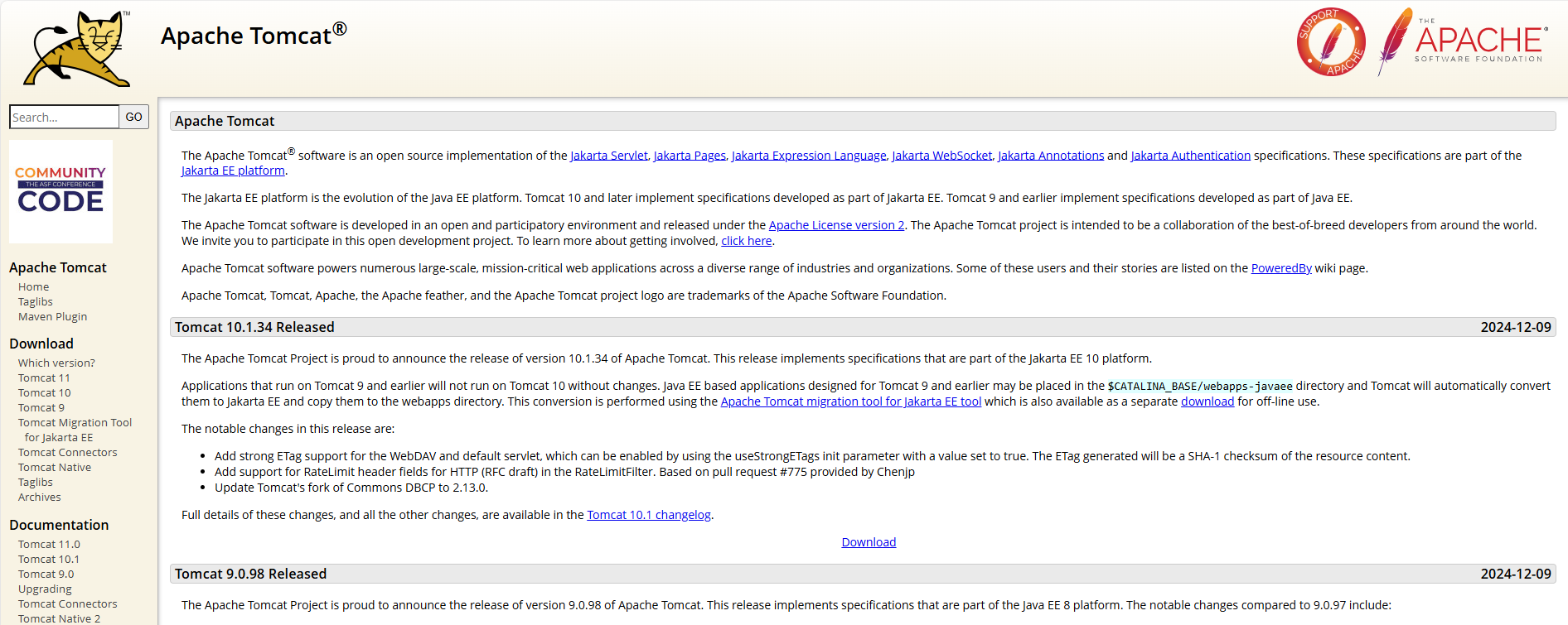 Apache Tomcat 다운로드 URL : https://tomcat.apache.org/